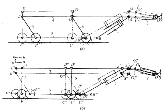 下图所示为油缸驱动步进送料机构。其动作如下:①油缸2的活塞杆不动,油缸1的活塞杆外伸时,使油缸2绕O点上摆,横梁4沿弧线 这样利用两个油缸交替动作使横梁按abcd的轨迹运动,以便运送物料。轧钢厂运送钢卷的步进梁采用了这种机构。 |