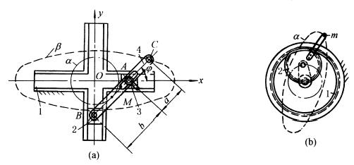 下图a,机架1上有直交的沟槽,其内滑块2、3分别组成移动副,滑块分别与杆4铰接。当滑块2、3在槽内移动时,杆4上除AB中点M画出以O为圆心,OM为半径的圆a外,杆上其余各点均为椭圆轨迹,如β。设杆4上AC=a,AB=b,杆的倾斜角为φ,则C点在坐标系中的坐标为: x=bcosφ+acosφ y=asinφ C点轨迹的椭圆方程为: