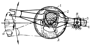 销A、B间的距离可调节,以变更长、短半轴的长度,因而可得到不同大小的椭圆。 图b,齿轮2沿固定内齿轮1作行星运动,齿轮2节圆直径等于齿轮1的节圆半径。当齿轮2作行星运动时,其上节圆外的一点m的运动轨迹为椭圆α。 椭圆仪机构除用于解算装置,绘椭圆曲线外,尚用于仪表及夹具的增力装置。 |