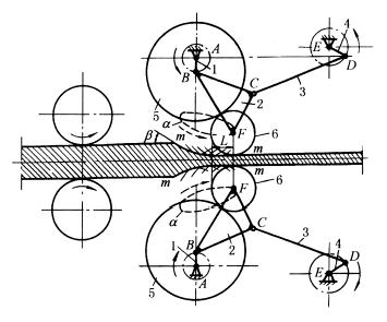 下图所示为振摆式轧钢机构,由上下对称的两个五杆机构组成,1、4为主动曲柄,5为支承辊,6为工作辊。当1、4转动时,工作辊的中心F按轨迹α曲线运动,并对钢材进行轧制。工作辊在不同位置时的包络线即为钢坯开口处的形状mm。轧辊与钢坯开始接触点处的咬入角β宜小,以减轻送料辊的载荷,直线段L宜长,使钢材表面平整。当机构各构件长度不变,仅改变两主动曲柄的转速,即可使杆2上点F的轨迹α及工作辊的包络线mm发生变化,使轧制钢坯的开口度相应地增加或减小。这样,当无专门的压下装置时,可轧制规格范围变化不大的各种轧件。 |