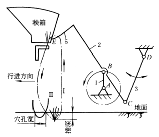 图(7)中,齿轮1、2分别绕定轴O1、O2转动,两轮相互啮合,齿轮1与连杆6组成回转副A,齿轮2与连杆7组成回转副B,连杆6、7组成回转副C。在连杆6、7上分别固接有和面爪3、4,其伸出长度可以调节。各构件间尺寸关系为:两齿轮的尺寸相同;AC=BC;O1A=O2B。在机构初始位置,O1A、O2B和O1O2共线,且在相反方向转动。和面爪4相对于连杆7可以固定在不同位置,构件5为盛面缸,可绕自身轴线转动。当齿轮1绕定轴O1转动时,和面爪3、4上的D、E点分别描绘出轨迹曲线d和e,可满足和面要求。 图(8)中,连杆2上固接着插秧爪5,工作时要求插秧爪模拟人手动作,从秧箱中取出秧后插入土中。插秧爪5从秧箱中分秧时走的轨迹要近似圆弧,以便插秧爪顺利分秧和取秧可靠;要求插秧爪入土后到插深位置时稍向后运动,出土时,渐成垂直走向,以保证不将插好的秧苗重新带出。 |