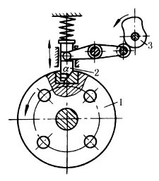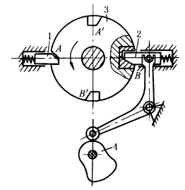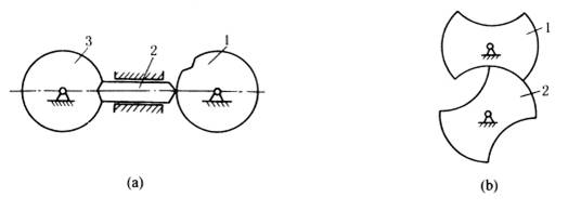 下图a,轮1的圆弧面将锁杆2推入3的凹槽中时,轮1可转动,轮3被锁住,只有1的凹口对着锁杆2时,轮3才能转动,这时锁杆2推入轮1的凹口中,将1锁住。 图b,一轮的凹弧与另一轮的凸弧相对时,凸弧的轮可以转动,而凹弧的轮被锁住,如图示为轮1被锁住。 |