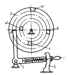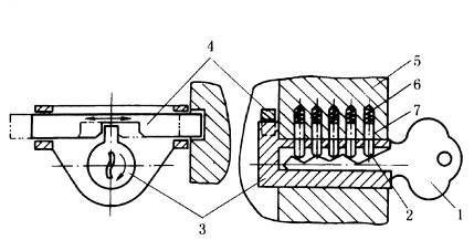 图(3)中,在件2的不同半径的圆周上,设置有挡块a、b、c、d,转动杠杆1,使1上的A端处于不同半径的圆周上,则相应圆周上的挡块与A接触时盘2被定在这位置上。 图(4)中,钥匙1使上排弹子7和下排弹子2刚好接触在3、5的分界面上,此时1可转动,并带动3转动,3的凸块拨动销子4,将它插入门框体5的孔中。如将1拨出,则弹子2、7一起下落,7将卡入3、5的分界面中阻止3转动,这样,就将4锁住。 |
