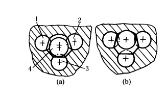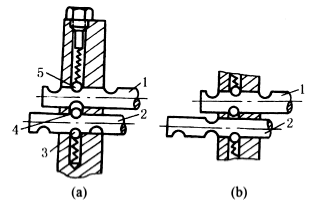 图(5)a中,轴1、2互相联锁,移动其中一根轴,则另一根轴被锁住。如先移动轴2,则2将钢球4向上推入轴1的凹槽中(图b),这时,轴1被锁住不能动,反之,轴1先移动时可将轴2锁住。 图(6)a中,1、2、3三根轴只能先移动一根,如先移动轴3,则将钢球4推入1、2的槽中。图b表示1、2被锁住位置。 |