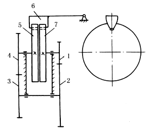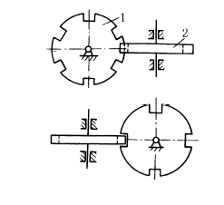 图(7)中,具有凹槽的定位盘5、7大小相同。齿轮1、2、3、4的齿数分别为z1=50,z2=150,z3=50,z4=50。初始位置时,两盘槽口对准,定位齿6插入两盘的槽中定位,拔出定位齿后,定位盘7开始转动,若7转1转或2转,则5仅转1/3或2/3转,两盘的槽口仍相互错开,6不能入槽口定位,只有当7转3转时5才转一转使两盘槽口对准,定位齿又插入槽中定位,所以盘5还可起计数的作用。 万能分度头要扩大原有分度孔板的分度数目时,就可依上述原理使孔板与分度销盘间产生差速转动。 如图(8)所示,轮2被锁住,只有当轮1的凹口对着轮2时,才可能转动轮2,锁住轮1。 |