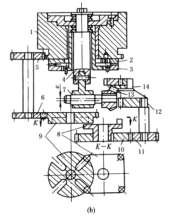 齿盘结构如下图a所示,牙齿断面形状是齿顶交角为90°的三角形齿,齿槽沿圆盘径向布置。两个齿盘的结构相同,一个固定在机座上,一个固定在转位盘上,两齿盘保持同心,如图b所示,上定位齿盘2固定在转位工作台1上,下定位齿盘3固定在机座上,工作台1需转位时,首先通过锥齿轮13、14,偏心轴7,连杆和滑动轴4,使工作台1升高,使上、下定位齿盘脱离,然后,由齿轮机构11、10,四销四槽槽轮机构8、9和齿轮6、5驱动工作台1转位,转位停止时,转动偏心轴7,使工作台落下,上、下齿盘相互嵌合而定位。 齿盘式定位机构的定位刚度和精度均较好。若要有较高的定位精度和刚度,则齿盘要精加工,工作齿面要进行研磨,欲使适应多种分度角的变化,可采用多对齿盘组成“差动式”定位装置。 |