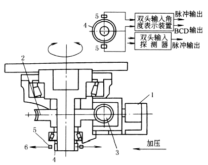下图所示为工业机器人水平转动部件,可作任意角度转动,往返定位精度±4"(手臂长500mm时,顶端定位误差在±0.01mm)。该机构使用了由直流伺服电动机驱动的高精度蜗杆蜗轮副3、2,同时应用液压缸1保证其经常为零齿侧间隙。采用交错控制方式,装有索尼公司生产的高精度回转刻度盘MSE-3600。图中,4为回转刻度盘,5为检测头,6为角度表示装置的输出。 |