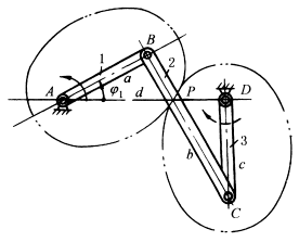 当φ1=0°时,i31=(i31)max=-(b+a)/(b-a) 当φ1=180°时, i31=(i31)min=-(b-a)/(b+a) 当主动曲柄转至与机架重合时,从动曲柄也与机架重合,这时形成机构运动的不确定状态,即曲柄继续向前转动时,从动曲柄有可能与主动曲柄同向转动,故必须用特殊装置(如死点引出器)或杆件惯性来渡过机构的不稳定状态。 |