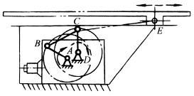 右图所示中,主动曲柄AB匀速转动,转换为曲柄CD的非匀速转动,但平均传动比等于1。若AD+CD<AB+BC,且AD<AB<BC<CD(或AD<BC<AB<CD)则机构没有死点位置。双点划线表示在此双曲柄机构上再相连一偏置曲柄滑块机构DCE,这是惯性筛的具体应用。由于双曲柄机构和偏置曲柄滑块机构均有急回特性,二者并用加强了急回效果,使筛子从右往左运动时,有较大的加速度,依靠物料惯性而达到筛分的目的。 |