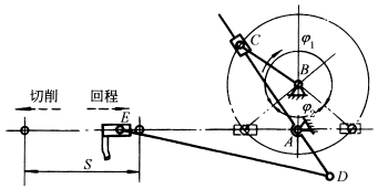如右图所示旋转导杆机构中,机架AB<曲柄BC,主动曲柄BC匀速转动,转换为旋转导杆CD的非匀速转动,平均传动比为1,其急回特性常用于刨床,使切削行程较慢,回程较快(BC顺时针方向转动φ1角时,滑块E以较慢的近于等速切削,而BC继续转动φ2角时,E快速返回)。行程S=2AD。比值BC/AB较小时,机构的动力性能变坏,一般推荐BC/AB>2。 |