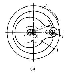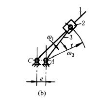 下图是用来传递轴心线不重合的联轴器结构,当盘1绕轴C转动时,通过圆盘1上的滑槽拨动盘3绕轴心A同向转动,同时销2将相对于滑槽滑动。图b是运动简图。导杆1作等速转动带动从动盘3作变速转动。当偏距e很小时,从动盘3的角速度变化平缓。 |