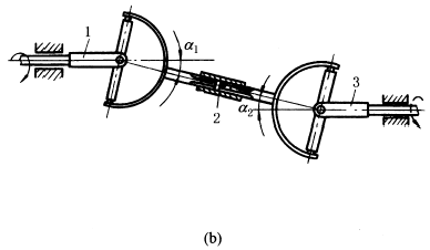 式中 φ1—— 主动轴上叉头从轴面(两轴所决定的平面)开始计算的转角。 由于瞬时传动比的变化,传动中将产生附加动载荷,并引起振动。为了消除这一缺点,一般多采用双万向联轴器。 图b为双万向联轴器,在主、从动轴1、3之间用一个中间轴2(即用花键套联接的轴)和两个万向联轴器联接,它可以传递任意位置的两轴间的回转运动。当中间轴2两端的叉面位于同一平面内且a1=a2时,可以得到主、从动轴间传动比恒等于1的匀速传动。 |