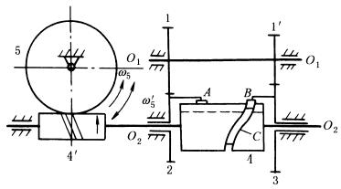 右图中,固联在主动轴O1上的齿轮1和1' 分别与活套在轴O2上的齿轮2和3啮合。齿轮2上的凸销A嵌于圆柱凸轮4的纵向直槽中,带动圆柱凸轮4一起回转并允许其沿轴向有相对位移;齿轮3上的滚子B装在圆柱凸轮4的曲线槽C中。由于齿轮2和齿轮3的转速有差异,所以滚子B在槽C内将发生相对运动,使凸轮4沿轴O2移动。当主动轴O1连续回转时,圆柱凸轮4及与其固结的蜗杆4' 将作转动兼移动的复合运动。从而传动蜗轮5。蜗杆4' 的等角速转动使蜗轮5以ω'5等角速转动,蜗杆4' 的变速移动使蜗轮5以ω5变角速转动,该蜗轮的运动为两者的合成而作时快时慢的变角速转动,以满足纺丝卷绕工艺的要求。 |