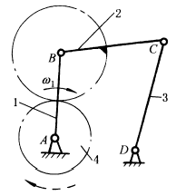 右图中,在四杆机构ABCD上装一对齿轮,行星齿轮2与连杆BC固连,中心轮4绕A轴转动。当主动曲柄1以ω1匀速转动时,从动齿轮4作非匀速转动,其角速度为: