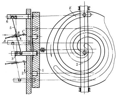 右图中,主动凸轮1表面刻有螺旋沟槽,在接近槽尾E的一段长度内,槽的底部逐渐变浅,从动部件上的A、B、C三点在一直线上时为杠杆5的平衡位置。当凸轮转动到销6进入槽的尾部时(实线位置),A点被迫向下越过平衡位置,使销3在弹簧4的作用下进入凸轮槽的头部,从动杆2开始向下运动,凸轮转过一周半后,销3到达槽尾并脱出(双点划线位置表示尚未到达槽尾的中间位置),A点被迫向上越过平衡位置,销3脱出,销6进入凸轮槽头部,杆2开始向上运动。凸轮每3转,从动杆2完成一个往复循环。 |