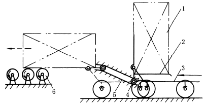 下图中,小车3向前推进时,铲斗2上的滚子4沿固定凸轮槽5运动,使铲斗逐渐倾侧,将包装箱1置于输出辊道6上。 |