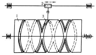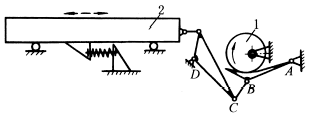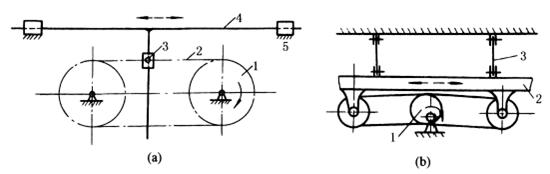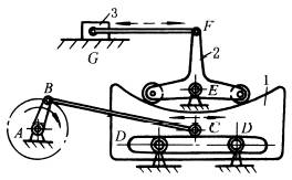 下图a,滑块3铰接在链条2上,T形导杆4可在滑块3中滑动,链轮1转动时,链条带着滑块3运动,从而带动导杆4在导轨5中作往复移动,当3在直线段时,4为等速运动,当3在圆弧段时,4作简谐运动。这种机构换向较平稳。 图b,主动偏心轮1转动,通过左右带轮带动筛体2往复摆动。筛体悬挂在平板弹簧3上。这种机构以两个挠性体代替曲柄摇杆机构中的连杆,同时悬挂采用板簧,能吸收一部分能量,动力性能较好。 |