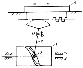 右图中,圆柱凸轮1上刻有往复螺旋槽,两螺旋槽的头尾均用圆滑圆弧相接,槽中有一与从动杆2的下端相连的船形导向块3,凸轮旋转时,从动杆2即被带动作往复移动。凸轮转过的转数为两条螺旋槽的总导程数时,从动杆完成一次往复循环。此机构效率较低,宜于慢速运动。在卷筒的导绳机构和纺纱机械中均有应用。 |