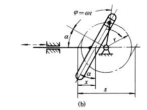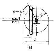 下图中,图a为正弦机构,主动曲柄作匀速转动时,从动导杆的速度按正弦规律作往复运动。 导杆行程s=2r; 导杆位移x=r(1-cosφ);