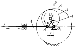 右图中,内齿轮3(半径为r3)固定,行星齿轮2的半径为r2,r3=2r2,杆4用铰链A连接在行星轮2的节圆上,当系杆1转动时,杆4沿O1X作往复移动,其运动规律为: x=2r2cosφ 这种机构用于快速印刷机中。 |