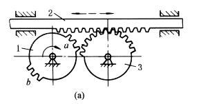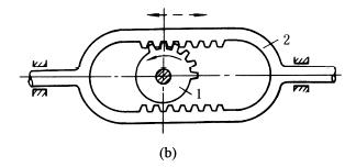 如下图a所示,不完全齿轮1顺时针方向旋转时,与不完全齿轮3啮合,齿轮3又与齿条2相啮合,并带动其向左移动,当齿轮1的轮齿a与齿轮3脱开时,轮齿b进入与齿条2啮合,从而带动齿条右移。改变齿轮1的齿数可调节齿条在两端的停歇时间。 图b所示,不完全齿轮1旋转时交替与上下齿条啮合,从而使构件2往复移动,并在两端有停歇。 不完全齿轮机构由于开始啮合和脱离啮合时都有严重冲击,只能用于低速、轻载。如印刷机等。 |