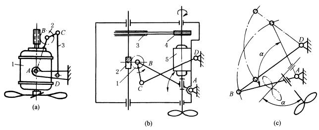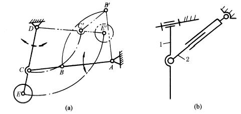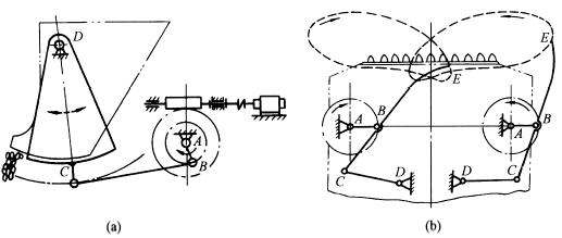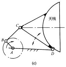 下图中,图a为摆动式给矿机构,蜗轮减速机通过曲柄摇杆机构ABCD带动闸门(与CD固联)往复摆动,实现间歇放矿。图b为装岩机扒矿机构,利用曲柄摇杆机构ABCD中连杆端部E点(扒爪)的环形轨迹扒取矿石。图c为用来调整雷达天线俯仰角度的曲柄摇杆机构。 |