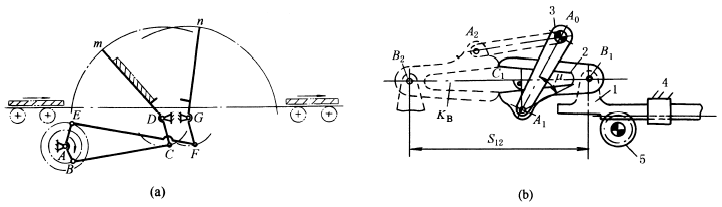 下图中,图a是利用两个曲柄摇杆机构ABCD和AEFG组合而成的翻板机构。金属板(双点划线所示)先由左端进入摇杆Dm再过渡到摇杆Gn,使金属板翻转180°由右端运走。应用于有色金属轧机后端用来翻转金属板。 图b是用于将薄片零件翻转180°的机构,构件1、2、3、4组成摇杆滑块机构,主动杆滑块(齿条)1,连杆2为夹持薄片零件的弯杆。当主动齿轮5逆时针方向转动,使齿条1向左移动距离S12,滑块与连杆2铰接点由位置B1移至位置B2时,连杆2与摇杆3的铰接点由位置A1转至位置A2,此时连杆2由位置A1B1移至A2B2,它在图示平面内转动180°,相应地使夹持的薄片也随之翻转180°。 |