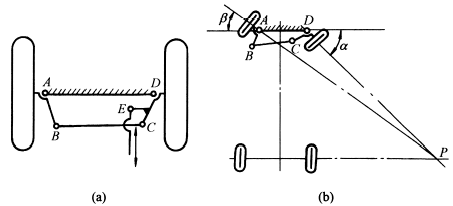 右图a中ABCD为等腰梯形的双摇杆机构,CD上带一拐臂,在E点与操纵杆相连。操纵杆使双摇杆摆动,并使两车轮转向,如图b,其特点是双摇杆控制的两车轮转角不等,即α≠β,使汽车在转弯时两前轮的轴线交点P能落在后轮轴线的延长线附近,尽可能实现轮胎与地面作纯滚动。 |