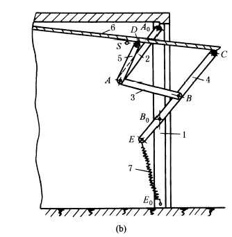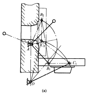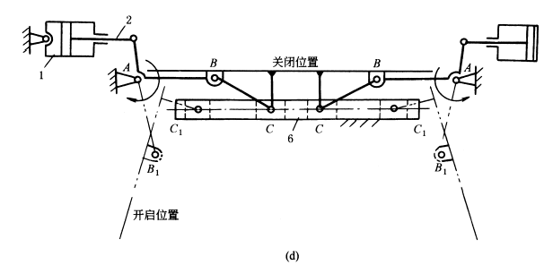 下图中,图a为加热炉炉门的开闭机构。炉门在双摇杆机构的实线位置时(AB1C1D)是启开位置,在双点划线位置(AB2C2D)表示关闭位置。这种炉门机构有如下特点: ①多铰接点位置应经过适当选择,使炉门在运动过程中不应发生轨迹干涉,即启闭过程中,炉门不应与炉壁相碰; ②开启时炉门呈水平位置,有利操作; ③开启时炉门的热面朝下,冷面朝上,操作条件较好。 图b为汽车库门的启闭机构,库门在由关闭到开启或由开启到关闭都应不与车库顶部或库内汽车相碰。此图为车库门启闭机构的结构简图,它是由铰链四杆机构A0ABB0和两杆组CDA组成的。杆6本身即为车库大门。当用手推拉杆4时,即能使库门启闭,弹簧E0E用以平衡库门重量,并能使库门在任一位置时均保持静止状态。此外,库门在启闭过程中所占的空间较小。 图c为车门开闭机构,ABC为摇杆滑块机构,当气缸带动摇杆AB转动到AB' 位置时,左车门BC(机构中的连杆)被打开到B'C ' 位置。通过反平行四边形机构AEFA1使右车门实现联动,反向转动相等的角度。 图d为两个驱动缸的车门开闭机构。 |