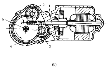 下图中,图a为刮水器结构,它由电机1、连杆2、枢轴3、传动机构4、刮臂5和刮片6组成。为了确保规定的刮刷面积,通常采用两个刮片同时工作。电机的旋转运动变成摇摆往复运动是通过电机输出轴的蜗轮蜗杆和曲柄摇杆机构实现。 图b为驱动电机及其蜗轮蜗杆机构。电机轴上的蜗杆1由左、右相反的两段螺旋组成,分别带动位于蜗杆轴两侧的双联齿轮2,3中的大齿轮同向转动。双联齿轮中的小齿轮与输出齿轮4啮合,输出齿轮4与输出轴5一起转动。输出轴5上连接有曲柄摇杆机构的曲柄。 |