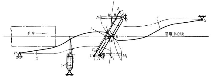 下图中,当井下列车通过风门时,通过行程开关,使气缸1动作,将碰杆2拉向双点划线位置,杆2端部有小轮3可在门DM的导槽中滑动,使DM绕D转动到DM1位置,再通过平行四边形机构DCBA推动另一扇门AN绕A转动到AN1位置。此时,两扇门打开,列车通过。列车通过以后,在电气系统作用下,风门重新关闭。如果电气系统有故障。经减速的列车可直接推动碰杆2(右行时)或4(左行时)将门打开。 |