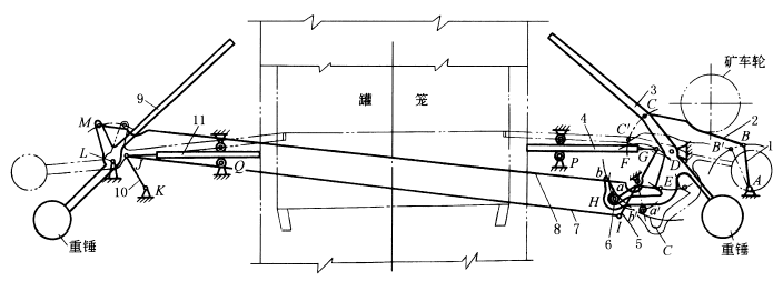 下图中,当罐笼停于井口时,为了使矿车平稳地进入罐笼,可采用摇台稳罐联动装置。摇台3、9可搭在罐笼上,使矿车经其上进入罐笼,稳罐器4、11从两侧顶住罐笼,不使其摇晃。当矿车进罐时,车轮压下杆2,带动摇台3绕D转动,同时摇台3的下部弯杆通过开口槽中的滚轮6带动杆5绕F点转动,使稳罐器4伸出,并稳住罐笼。杆3、5分别通过与其上E、I点铰接的杆8、7带动罐笼另一侧的摇台9与稳罐器11动作。当摇台3转动到使稳罐器4、11全部伸出时(即已从两边顶住罐笼),滚轮6正好离开弯杆上的开口槽C,到达弯杆的圆弧面a' b'上(圆弧面ab、a' b' 的圆心为D),摇台3继续绕D转动到双点划线位置,此时稳罐器4、11不再跟随摇台3动作,处于不动位置。矿车进入罐笼以后,摇台3、9在重锤作用下复位,同时稳罐器的滚轮6重新进入槽C被摇台3带动复位。 此装置是由多个产生往复摇动的平面连杆机构组成,即由四杆铰链机构ABCD带动两个反平行四边形机构DEML和FIJK实现两侧同时动作。通过杆3延长体的弯杆部分DH与滚轮6及摇杆5实现摇台3与稳罐器4联动或脱离。 往复移动和往复摆动的机构,还可通过各种自动换向装置实现,这里不予列举。 |