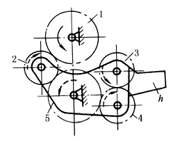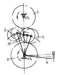 图(1)中,主动轮1与从动轮4间装有惰轮2和3,2与3装在三角形支承架H上,H可绕轴O4转动。H位于Ⅰ时(图中实线所示,1与2,2与3,3与4啮合)各轮转向如图示;H位于Ⅲ时(图中双点划线所示,1与3,3与4啮合),轮4换向;H位于Ⅱ时(2、3均不与1、4啮合),轮4不转。换向杆h必须有良好的固定,因H上受的力矩有使其转变方向的趋势。 图(2)与图(1)原理相同,但多一个惰轮,可减小主、从动轮的中心距,没有使换向杆h改变方向的力矩。 |