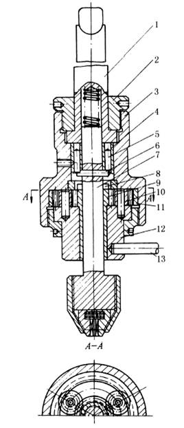 下图所示的攻丝工具的拨销换向机构中,锥柄1和套筒体3用螺母2压紧,靠接触面的摩擦力带动3转动。带有拨销5的套筒4用紧定螺钉与3固结。锥柄1向下移动到丝维接触工件时,攻丝头轴7上的销子6插入销子5之间,攻丝头与锥柄同速转动。攻丝完毕时,6自动与销子5脱离接触,若将锥柄1向上抬起,则7借压缩弹簧的作用力使销6进入中心齿轮9上的销槽8中;此时,若使13被挡住不动,则固结在3上的内齿轮11通过三个小齿轮10和齿轮9带动轴7快速反向转动,将丝锥退出工件。这种装置的特点是整个工作过程中,锥柄既不需反转,又能使攻丝头慢速攻丝、快速退出,并且结构简单,制造、操作方便。 |