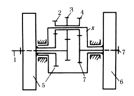 图(3)中,主动轴1和从动轴7上分别空套有刹车轮5和6,齿轮2、3、4为三联齿轮,套在和轮6固连的系杆x上。刹住轮6时,系统是定轴轮系,按1-3-4-7传动,轴7与轴1同向转动;刹住轮5时,轴1通过有同一转臂x的两个行星轮系1-3-2-5和5-2-4-7使轴7转动,这时轴7的转速为: