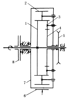 当z3z5>z1z2或z4z5>z2z7时,轴7的转向与轴1相反,这时,只要变换刹车轮即可换向变速,而不需停车。 图(4)为履带式水稻收割机的转向装置。1为主动齿轮,5为从动链轮,6是制动器,7为可转动架体,8为摩擦离合器。当离合器8接通(n1=n7),制动器6松开时,5与1等速同向转动。 |