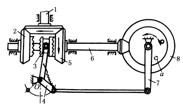 图(7)中,主动锥齿轮1与空套在轴6上的锥齿轮2、5啮合,通过离合器3(用滑键与轴6联接)将运动传递到从动锥齿轮8。当离合器3在右边时,按1-5-3-6-8传动,锥齿轮8作顺时针方向转动。当8上的销子a到达虚线位置时,推动杆7(空套在轮8的轴上)并使杆4顺时针方向转动,当杆4偏移至O点左侧,弹簧拉动离合器3至左边,此时,按1-2-3-6-8传动,轮8作逆时针方向转动,销子a从左边推动杆7,实现周期性自动换向。 |