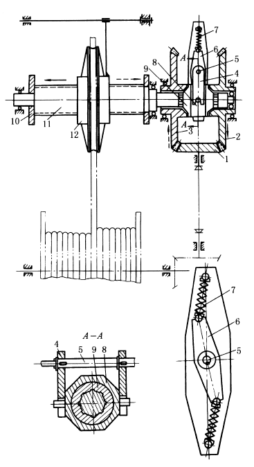 下图中,卷筒轴上的锥齿轮通过万向联轴器带动导绳装置的输入锥齿轮1,拨叉4处于中间位置时锥齿轮2、3反向空转。拨叉固定在竖轴5上,竖轴5与摆杆6固连,摆杆两端用串联碟形弹簧7压紧,拨叉在中间位置时牙嵌离合器9与两边锥齿轮2和3之间有相等的少量间隙,此时两弹簧和摆杆6处于一直线上。使用前调整好导向滑轮12与卷筒上钢丝绳的相互位置,并使摆杆6朝某一方向偏离(按图示滑轮与钢绳的位置,4应向右偏)从而推动拨环8并带动离合器9,使其与锥齿轮2(或3)啮合,螺杆11被带动旋转,从而带动滑轮12作轴向移动。当滑轮到达左端并被挡板10挡住,阻力矩增大,通过锥齿轮2与离合器间的啮合斜面相互作用,克服弹簧反力矩使摆杆6(或4)向左摆动,离合器脱开并自动与对面锥齿轮3啮合,螺杆11反向旋转,导轮12反向移动,如此自动往复完成钢绳多层缠绕。 |