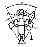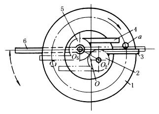 图(8)中,棘爪2在实线位置时,摆杆1带动棘轮3作顺时针方向转动,棘爪在虚线位置时,棘轮作逆时针方向转动。 图(9)中,杆4、6与齿轮5固连,杆3与齿轮2固连,两齿轮啮合,当轮1绕固定中心O顺时针方向转动时,轮1上的销a推动杆3转动,并带动两齿轮2、5绕各自的固定中心O2、O5转动,使3、4、6分别转动到双点划线位置。接着销a推动杆4,使从动杆6换向。这样循环下去,轮1每转一圈,从动杆6往复摆动180°。 |