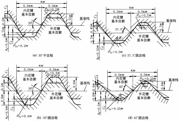 允许平齿根和圆齿根的基本齿廓在内、外花键上混合使用 |
