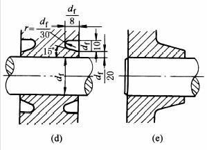 为了便于装配,对结构的要求: (1)包容件的孔端和被包容件的进入端应有倒角,通常取倒角α为5°或10°,倒角尺寸可按表过盈联接零件孔端和进入端倒角尺寸选定; (2)当轴承受较大的变载荷时,包容件的孔端应倒圆角,以提高轴的疲劳强度; (3)结合长度一般不宜超过结合直径df的1.6倍,如结合长度过长,结合直径宜制成阶梯形,以改善装配工艺; (4)轴与盲孔的过盈配合,应有排气孔; (5)结合面的粗糙度一般不宜大于Ra6.3μm; (6)结合材料相同时,为避免压入时发生粘着现象,包容面与被包容面应有不同的硬度。有关其他装配要求请查阅GB/T 5371—1985附录D。 |