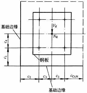cCr,N—特征边距; c1—沿剪力方向的锚栓边距; c4—沿剪力反方向的锚栓边距; c2、c3—垂直于剪力方向的锚栓边距; 虚线—表示非实际锚固基础边缘; Nd—轴向拉力;Vd—横向剪力 |