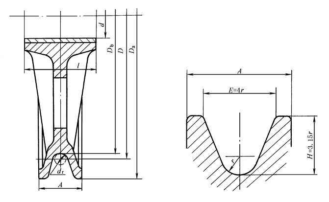 式中 drm——钢丝绳直径的平均值,mm α——钢丝直径公差的 β——槽底半径公差的 把计算所得的值圆整为R20中的优先数。 (4)确定轮缘宽度A 轮缘宽度A根据经验式为