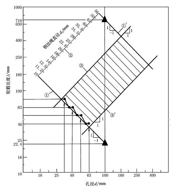 这个关系式在按优先数刻度的d-l坐标中是斜率为-1的直线(如图2所示),只要算出任意一点就能画出此直线。取孔径d=100mm=10cm,钢丝绳直径分别取最小(dr=10mm,P=20kN)和最大(dr=56mm,P=630kN)两种情况,则轮毂长度l为: