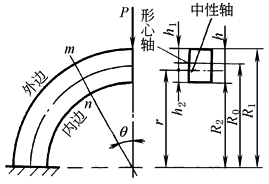 曲杆任意截面m—n上 法向力:N=Psinθ 弯矩:M=PR0sinθ;曲杆内外边缘的正应力: