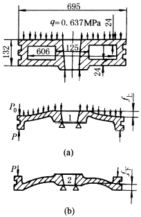 ③板表面上的均布载荷q=0.637MPa。 上板的支承及载荷特性如表圆环形平板计算公式中的11和12两项叠加。 在①、②两个力作用下,板外周界的挠度 在③力作用下,板外周界的挠度可按表圆环形平板计算公式中的12项公式