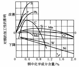 C:0.25%~0.35%左右最好 Mn:当C<0.2%时1.5%最好 Ni:>8%加工更困难 Mo:0.15%~0.40%时,稍提高;当淬火钢硬度为HB>350时,加入一些Mo,可提高其加工性