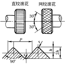 注:1.表中 h=0.785m-0.414r。 2.滚花前工件表面粗糙度的轮廓算术平均偏差Ra的最大允许值为12.5μm。 3.滚花后工件直径大于滚花前直径,其值D≈(0.8~1.6) m,m 为模数。 |