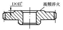 齿轮端面淬火时,淬火部分应凸起不小于1mm,并倒成45°角 |