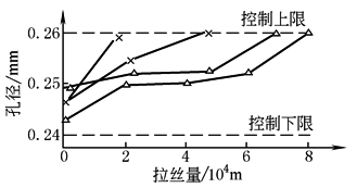涂层与末涂层拉丝模的对比磨损曲线 Δ—多层涂层模;×—非涂层模(YG8) |